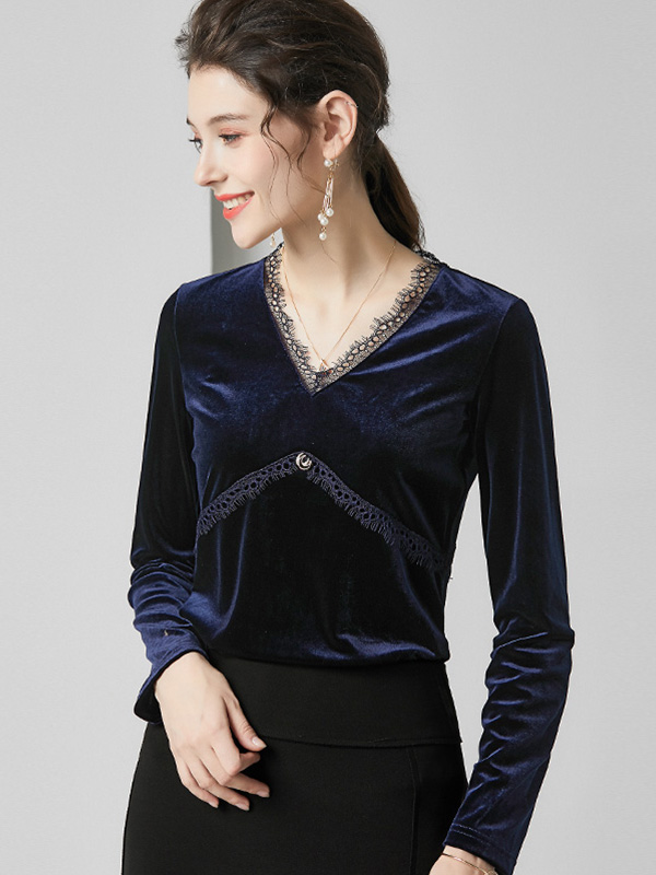627063 睫毛边V领长袖金丝绒上衣女 拼接镂空纯色露背修身打底衫
